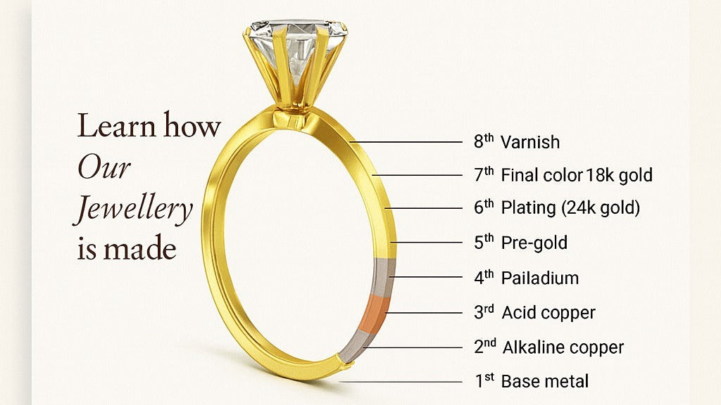 We craft our jewelry with high-quality brass, a durable and versatile alloy of copper and zinc that gives a rich golden hue, reminiscent of solid gold. Brass is naturally strong yet lightweight, making it ideal for creating pieces with a luxurious look and feel.